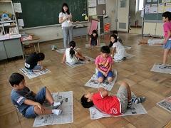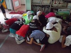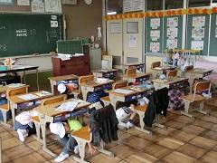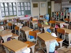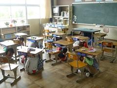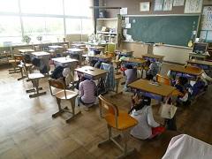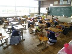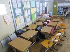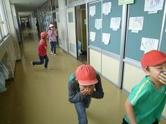 業間を利用して、竜巻発生を想定した避難訓練を行いました。子どもたちは真剣に取り組んでいました。