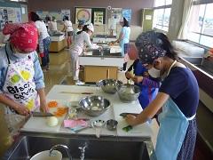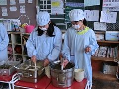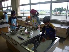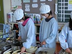 6年生が調理実習で野菜の彩り炒めとスクランブルエッグを作りました。班で協力して手際よく調理ができました。