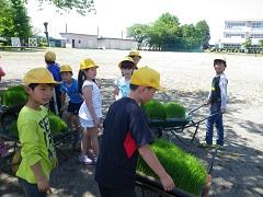 13日(金)に5年生が田植えに備えて、ビニルハウスから田んぼに苗を運びました。苗箱を落とさないように慎重に作業をしました。田植えは、23日(月)に予定しています。