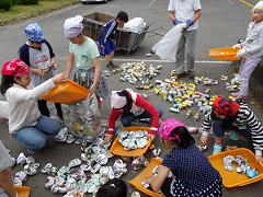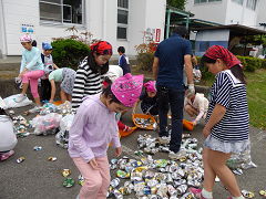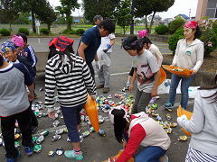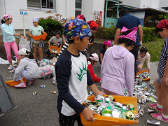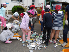 回収しているアルミ缶がたくさん集まり、収納場所がいっぱいになってしまってので、急遽6年生が昼休みにボランティアでつぶしてくれました。6年生はよく働きます。