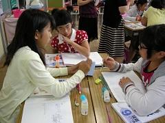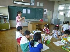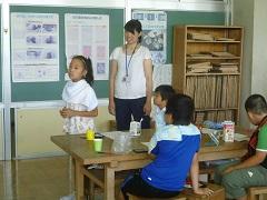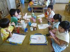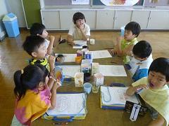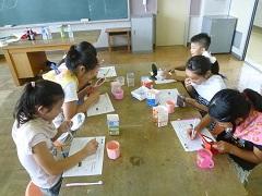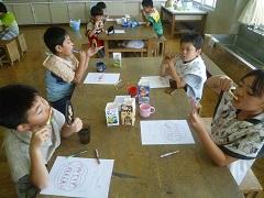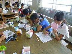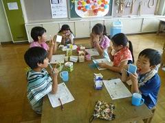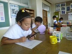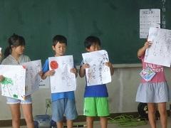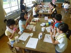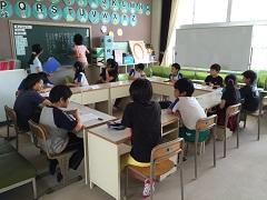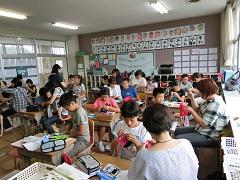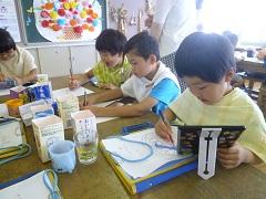 今日は、夏季PTAで授業参観を行いました。1年生は生活科の「みずにうくものをつくってあそうぼう」の授業です。身近な材料を使って水に浮くものを作りました。