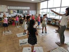 6年生は外国語活動の「Lesson3 I can swim」の授業です。動作を表す語や「できる」「できない」という表現に慣れ親しみました。