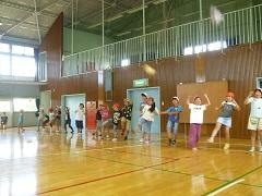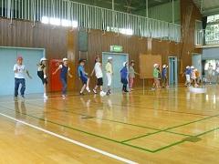 今日のふれあいタイムは体育館で「くつ飛ばし」を行いました。梅雨空を吹き飛ばそうと、「あ~した天気にな~れ!」の大きなかけ声とともに、ふれあい班ごとにくつを飛ばし、その距離を競いました。