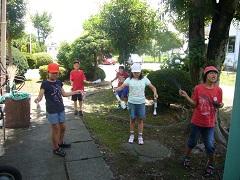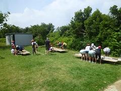 三日目の午前中の活動は、いかだ・カヌー体験です。オールの使い方の練習をした後、子どもたちで協力していかだを組み立てました。
