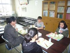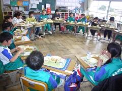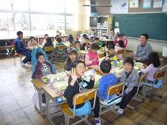 6年生と楽しく給食を食べることで、感謝の気持ちと豊かな人間関係の醸成を図るため、2月29日(月)~3月8日(火)までお別れ給食を実施しています。6年生が数人ずつ1~5年生教室と校長室、職員室に行き給食を食べます。校長室に来た子どもたちは少し緊張気味でした。