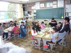 1・2年生は、「にこにこ元気あきまつり~おみこしわっしょいドドンガドン~」の題名で発表しました。まず、全員で歌を歌い、おみこしを担ぎました。その後、グループに分かれ、電車・おかしやさん・釣り堀・ボウリング場・劇などを行いました。また、農園で育てたとうもろこしをポップコ-ンにして配りました。6年生が招待され一緒に楽しみました。