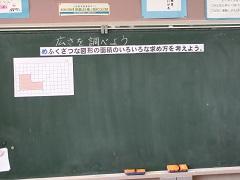2校時に、4年生が算数の研究授業を行いました。単元名は「広さを調べよう」で、内容は「面積の求め方の工夫」でした。授業の前半の課題はクリアできましたが、後半の課題は難しくペアで協力して取り組んでもなかなか解決できませんでしたが、授業の最後にはやっと正解にたどり着きました。