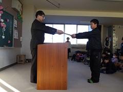 さくら警察署の職員の協力を得て、不審者侵入対応の避難訓練を行いました。6年教室に不審者が侵入したことを想定し、職員の対応や児童の体育館への避難などを訓練しました。不審者役の迫真の演技により、本番さながらの訓練ができました。その後、職員に対してさすまたの使い方についての指導がありました。