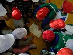 今朝の朝の活動は、児童集会を行いました。今回は、保健給食委員会の企画です。内容は、かぜ予防に関してです。まず、かぜ予防のポイントの説明があり、その後クイズが出題されました。最後に、ふれあい班ごとにかるたの最初の文字を考えました。わかりやすい発表で、かぜ予防に対する子どもたちの意識が高まりました。