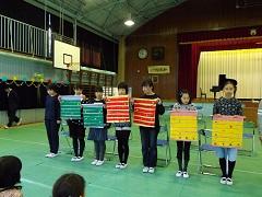 今日は、体育館で6年生を送る会を行いました。人間すごろくゲームで楽しく遊んだ後、1~5年生から色紙と歌のプレゼントをしました。6年生からは、詩の朗読と名前が彫ってある消しゴムのお返しがありました。お互いの感謝の気持ちがあふれた、とても心温まる会でした。なお、5年生が中心に企画し、4年生もお手伝いをしました。