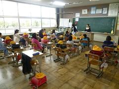 町立学校給食センターの学校栄養士が来校し、1年生に対して食指導が行われました。内容は、食事のマナーに関する話でした。