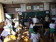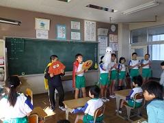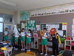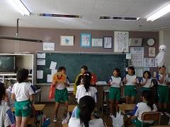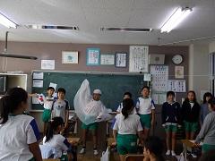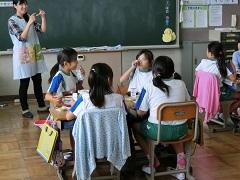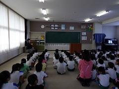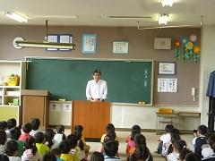 歯科衛生士の大園さんによる歯科保健指導を行いました。歯の役割・仕組み・虫歯のでき方・予防法等についての話の後、染め出しを実施し、最後に、ブラッシング指導を受けました。子どもたちは、給食後、さっそく正しい歯磨きを実践していました。