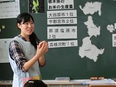 町立学校給食センターの学校栄養士が来校し、5年生に対して食指導が行われました。栃木県内でのお米の生産量に関する説明を聞きました。ちなみに今日の献立は、上高根沢小学校のリクエスト給食でした。また、5年生のみ陶器の食器でさらにおいしく食べることができました。