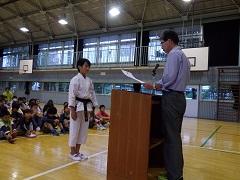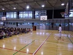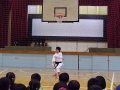 今日の朝会で、バスケットボール部と髙橋かなえさん(4年)の表彰を行いました。髙橋さんは、空手の全国大会の学年別形の部で優勝(2連覇)、アジア・オセアニア大会で学年別形の部で3位という成績でした。表彰の後、全児童の前で技を披露してもらいました。子どもたちも、教職員もそのすばらしさに感動しました。