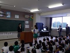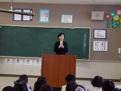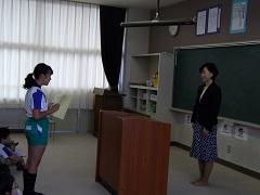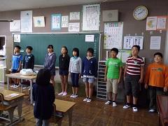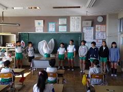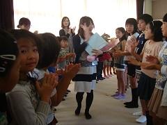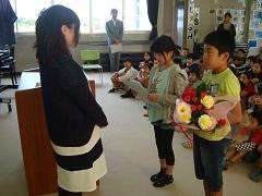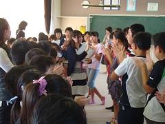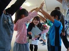 3年担任の大野講師が出産準備のため、退職することになり、今朝離任式を行いました。児童代表によるお別れのことば・花束贈呈の後、大野先生からお別れのあいさつがありました。最後に全児童で花道を作り、拍手で見送りました。たいへんお世話になりました。