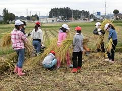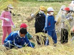 環境ボランティアの赤羽さん指導のもと、学校田の稲刈りを行いました。子どもたちは、手際よく稲を刈り、コンバインに運びました。収穫したお米は、ふれあいバザーの時に食べる予定です。
