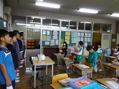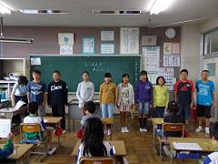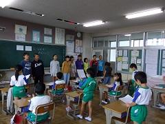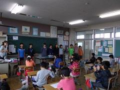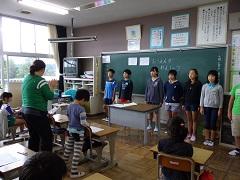 朝の会の時間に6年生が各学年の教室を訪問し、運動会の応援歌の練習をしました。