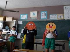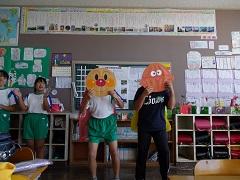 今朝の赤組の応援歌の練習に、アンパンマンとカレーパンマンがかけつけてくれました。白組にはなぜか「てるてるまん」が昨日に引き続き参上しました。