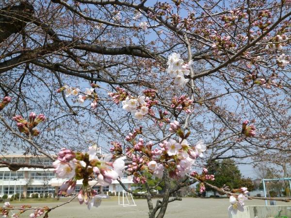 暖かい日が続き、校庭の桜がついに咲き始めました。