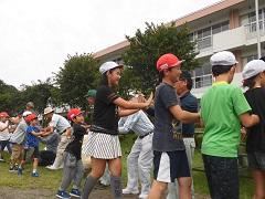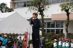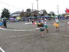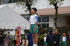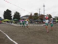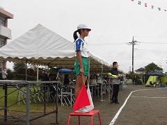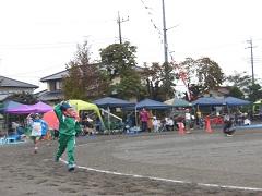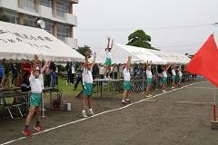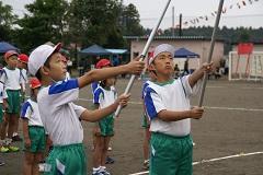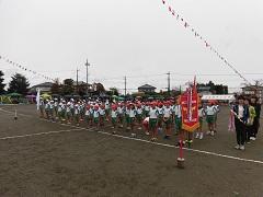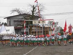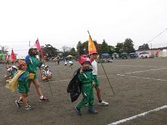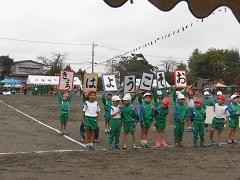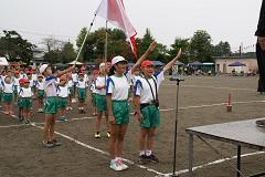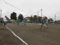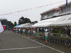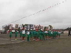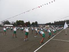 14日(土)に運動会を行いました。前日から雨が降り出し、当日の朝も小雨模様でしたが、日中は雨が降らないという天気予報を信じて、6時に花火を打ち上げました。グランドの状態もよくありませんでしたが、保護者や職員の懸命の作業により競技に支障のない状態になりました。まず、開会式に引き続きラジオ体操を行いました。 特に、赤白団長の「ちかいのことば」は大きな声で正正堂堂とできました。