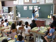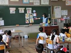 町立学校給食センターの栄養教諭が来校し、2年生を対象に食指導が行われました。「好き嫌いなく何でも食べよう」というタイトルで栄養に関する話を聞きました。子どもたちは、質問に素早く答えるなど意欲的でした。