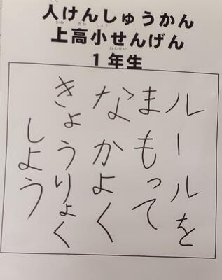 教室の入口には、クラスで考えたいじめ防止標語「上高小宣言」が掲示されました。人権週間中、朝の会でクラスの標語を確認し、帰りの会で振り返ります。