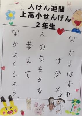 人権擁護員の皆様による「人権教室」、誰もが認められるクラスを目指した「上高小宣言」の作成、友達にされて嬉しかったことに感謝する「みんなのすてき」の作成、給食時の校内放送での「友達のよいところ発見!タイム」の発表、人権意識の高揚につながる本の読み聞かせ、人権に関する題材を取り上げた道徳授業等、様々な活動を実施し、人権意識の高揚を図っていきます。