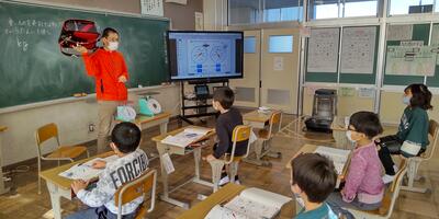 5年生は「社会」の授業です。環境にやさしい自動車について学習しています。