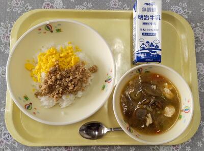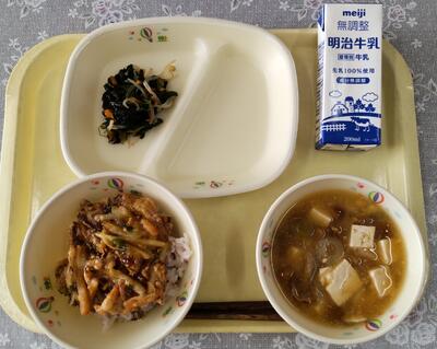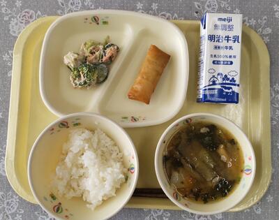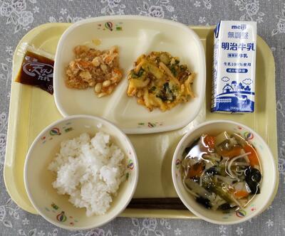 今日の給食は、北小学校の6年生の皆さんが考えてくださったリクエスト給食です。「体の調子を整える野菜、体のエネルギーとなるご飯、体をつくるもとになるお肉や卵などを入れ、栄養バランスを考えた献立です。」というコメントをいただきました。北小学校の皆さん、ありがとうございました。