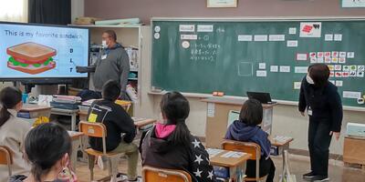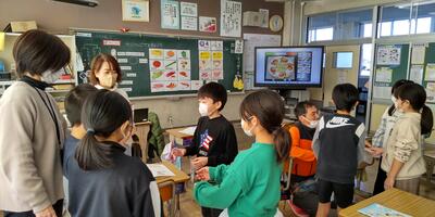 6年生は「外国語科」の時間です。いろいろな食材を、栄養素のグループに分けて伝えるのですね。