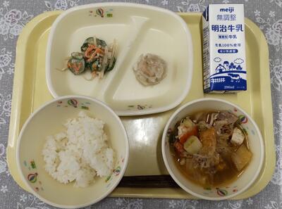 今日は「カミカミメニュー」です。 しっかりよくかむと、食べ物が細かくかみ砕かれ、更に消化酵素が含まれている唾液もたくさん出るため、消火がよくなります。またかむことで脳への血流量が増えるので脳の働きも活性化されます。一口30回を目標によくかんで食べたいですね。