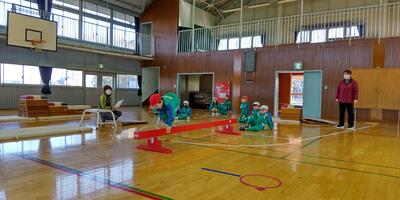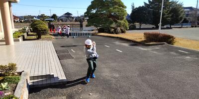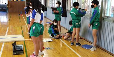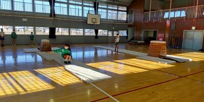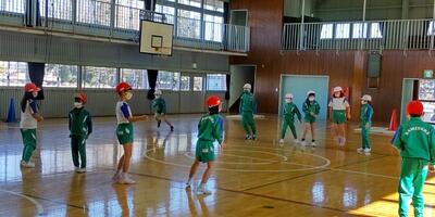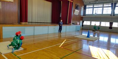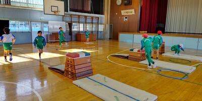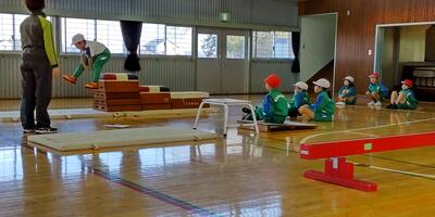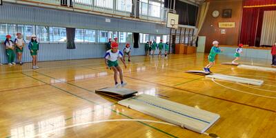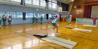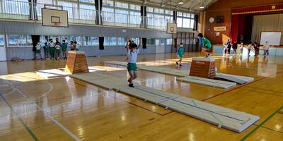 2年生は「体育」の授業です。1年生の時と比べて跳ぶ力もつきました。