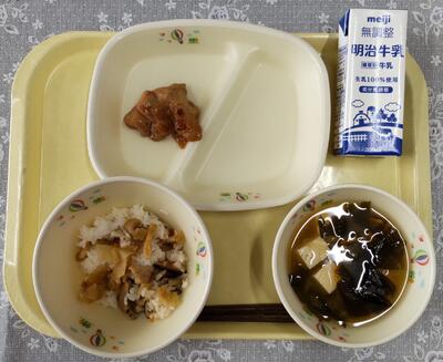 今日のけんちん汁は町内産のきのこを使った「きのこけんちん汁」です。まいたけのだしとなめこのぬめりがけんちん汁をおいしくしてくれています。給食で使ってくださっている「なめこ」や「まいたけ」「しいたけ」「きくらげ」は年間を通して町内産を使用し、使用率100%だそうです。安心していただけますね。