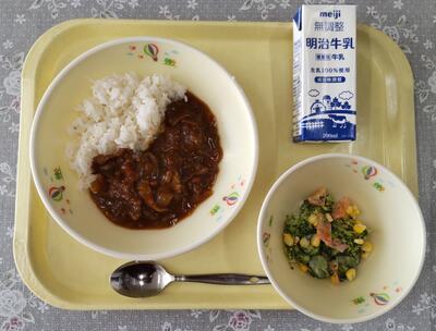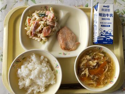 今日は、「ひじきサラダ」です。成長期である小学生の皆さんの身体は鉄とカルシウムをたくさん必要としています。ひじきはそのどちらの栄養素も多く含むため、すすんで食べてほしい食品です。
