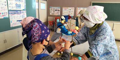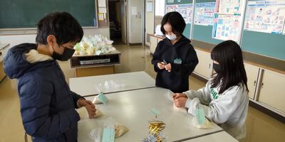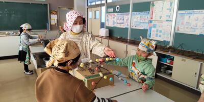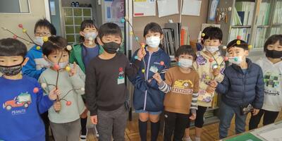 生活科の時間に、1年生が、シニアクラブの6名の皆様と一緒にまゆ玉作りを行いました。まゆ玉飾りは、作物の豊かな「実り」を表現したもので、今年の豊作を願って作るものだそうです。子どもたちは自分たちで作ったまゆ玉をミズの木に上手に飾り付けていました。エゴノキは、シニアクラブからいただいたも物を使わせていただきました。お忙しい中、子どもたちのために御協力をいただき、ありがとうございました。