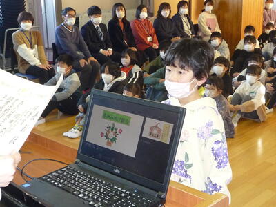 表彰後の、冬休み明け朝会では、おせち料理の意味や日本の伝統的な食事である和食、バランスのとれた給食などの食についてお話しました。
