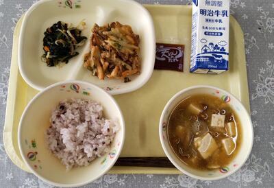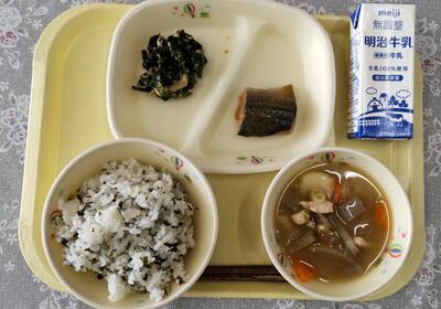 今日は、阿久津中学校1年2組の皆さんが家庭科の授業で考えてくださった献立です。「県内産のほうれん草を使ったのりの酢和えと、野菜たっぷりのすいとん汁を組み合わせました」というコメントをいただきました。町が取り組んでいる伝統料理の「すいとん汁」を取り入れてくださったのですね。