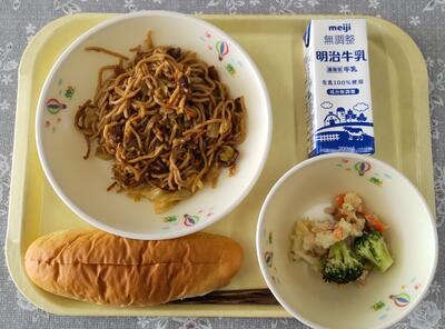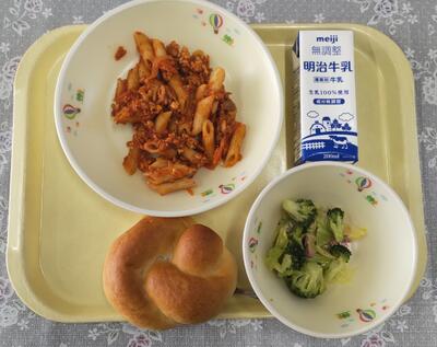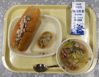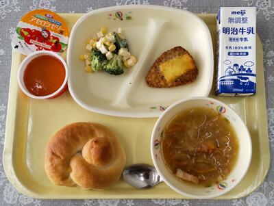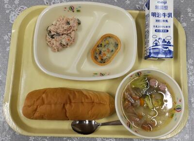 今日は、阿久津中学校1年3組の皆さんが家庭科の授業で考えてくださった献立です。「米粉パンやミネストローネスープなど、みんなが好きなメニューを取り入れ、栄養バランスやいろどりをよくできるように考えました。」というコメントをいただいています。