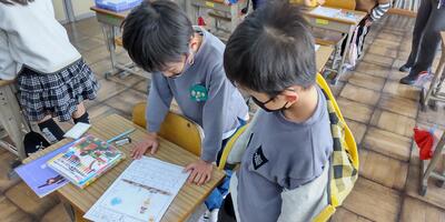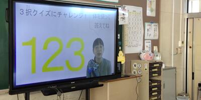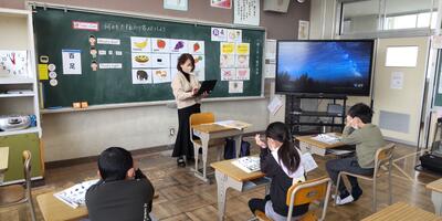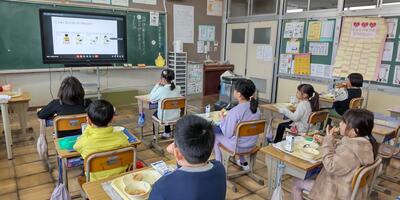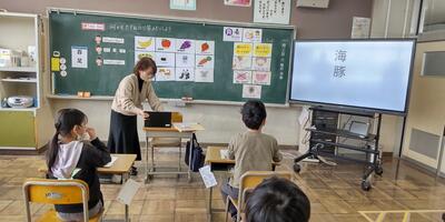 3年生は「外国語活動」の授業です。今日は読み方の難しい漢字も登場しています。