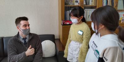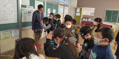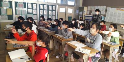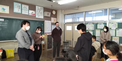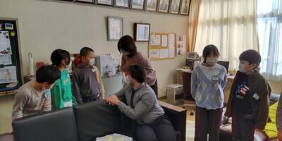 まずは4年生が、習った英語をいかして、校長室から6年教室までの案内をオールイングリッシュで行いました。3名の先生方からの質問にも正確に応えることができました。