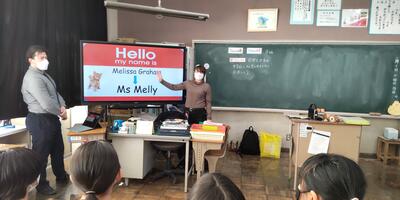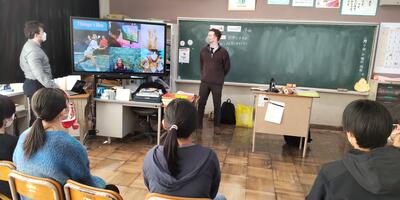 本日は6年生を対象にした「国際交流集会」です。町内2中学校のALTであるマシュー・グラハム 先生、メリッサ・グラハム 先生、ダニエル・ソーン 先生の3名の先生方がおいでくださいました。