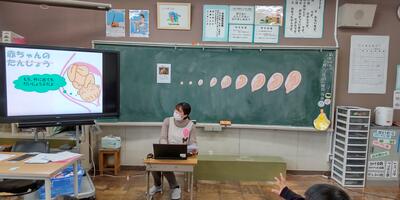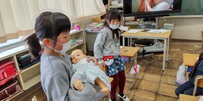 2年生は「学級活動」の授業です。養護教諭の先生に、自分がどのように生まれてきたのかを教えていただきました。針の穴くらいの小さな自分が、大切にお母さんのお腹の中で育って大きくなっていくことに驚いた様子の2年生。誕生した時と同じくらいの重さの「赤ちゃん人形」も抱っこしてみました。