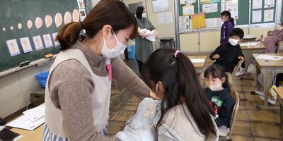 皆さんは、給食の前によく手を洗っていますか。冷たいからといって手を少し水でぬらす程度では汚れを洗い流すことはできません。石けんをよく泡立てて、手のひらや甲、爪の中まで丁寧に洗い、十分に水で泡を洗い流したあと、清潔なハンカチで拭きましょう。
