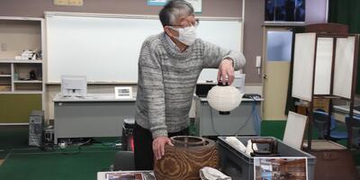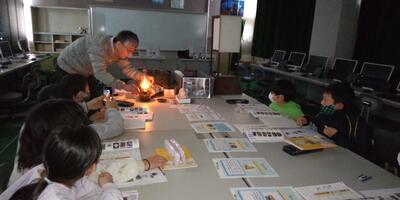 3年生は「社会」の授業です。本日は、高根沢町歴史民俗資料館の石橋先生にお越しいただき、明かりの移り変わりについて教えていただきました。燭台や行灯、ランプに実際に火をつけていただき、昔の人々の暮らしについて考えました。