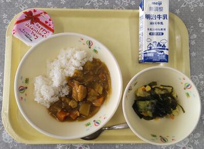 今日の給食は「バレンタインデーメニュー」です。日本のバレンタインデーは女性から男性へのチョコレートなどの贈り物をするイメージが強いですが、ヨーロッパでは、友人や家族など親しい人に花束やケーキ、カードなどを贈り、愛情を伝える日として広まっています。給食センターからは、デザートのチョコプリンを贈ってくださいました。