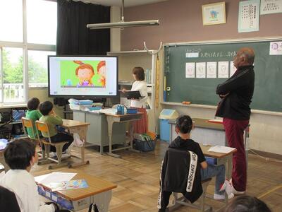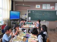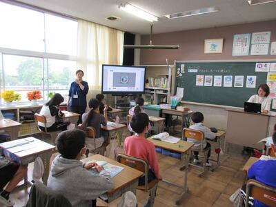 お弁当を食べている場面の絵を見ながら、英語の表現に慣れ親しむことができました。