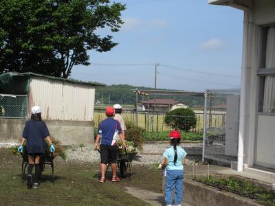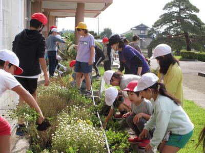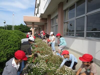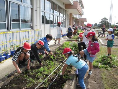 秋の終わり頃から目を楽しませてくれた、スノーポール、パンジー、ビオラなどの花が終わりに近づいてきたので、校舎前の花だんの花の片づけを、ふれあい班(縦割り班)ごとに行いました。