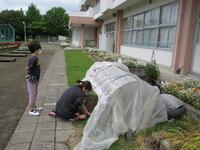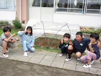 職員室前につくったハウスに移動し、温度管理をしながら苗を育てます。
