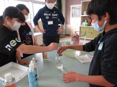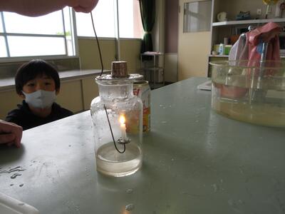 「窒素、酸素、二酸化炭素」それぞれの気体の中にろうそくの火を入れるとどうなるか、実験して調べました。