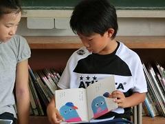 今週の朝の活動は、読書週間です。今朝は、5・6年生の図書委員が1・2年生の教室を訪問し、読み語りをしました。読む方も、聞く方もたいへんよくできました。